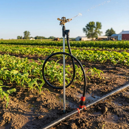 Kit für die landwirtschaftliche Bewässerung für Sprinkleranlagen, mit dem jeder auf dem Markt erhältliche 1/2-Sprinkler auf der oberen Basis installiert werden kann. Unterstützung für 1/2 Sprinkler. 1,2 Meter 9 x 13 mm PVC-Rohr. Metallstab 8mm 1,2 Meter hoch. Anschluss an die Hauptbewässerungsleitung. Für diesen Artikel empfehlen wir den Kauf von Sprinklern: Klicken Sie hier.