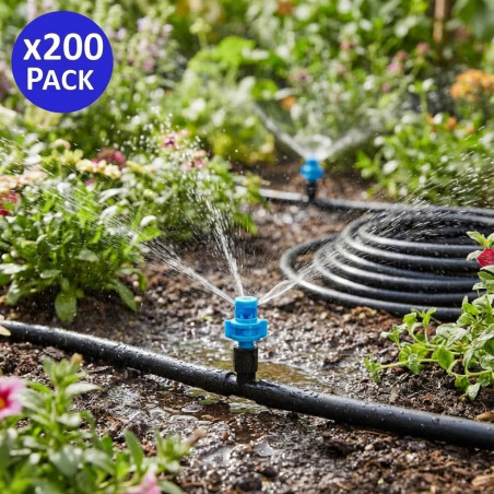 Bewässerungs-Mikrosprinkler mit einer Reichweite von 1 bis 1,5 Metern in Blau. Dieses Paket enthält 200 Einheiten, um Ihren gesamten Bewässerungsbedarf im Garten oder Obstgarten zu decken. Ideal, um Ihre Pflanzen gut mit Feuchtigkeit versorgt und gesund zu halten.