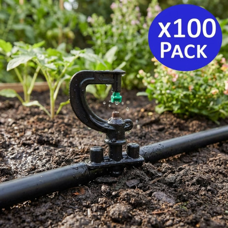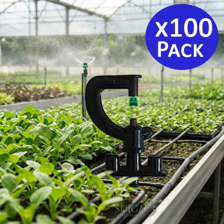 Mikro-Sprinkler mit festem 90°-Bewässerungswinkel. Durchflussmenge 73 bis 125 l/h. Reichweitenradius 1,7 Meter. Hergestellt in Spanien aus hochwertigen Kunststoffmaterialien. Beutel mit 100 Einheiten. Bei größeren Mengen Preis erfragen.