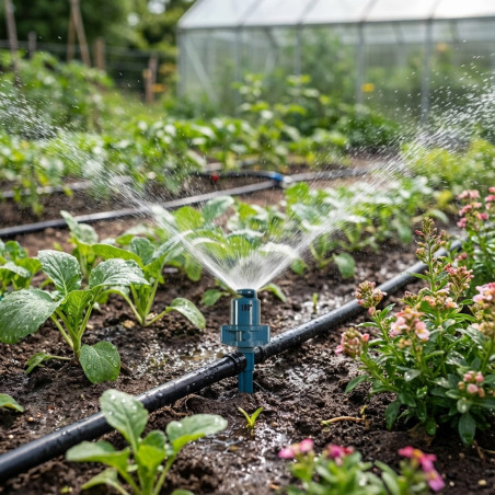 Um den Mikrobewässerungssprinkler zu installieren, klicken Sie einfach direkt in die Tropfleitung und stellen Sie sicher, dass der Wasserdruck im empfohlenen Bereich liegt.