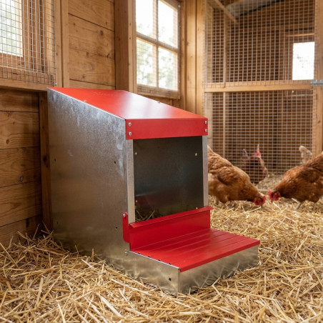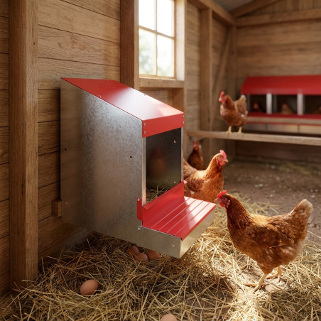 Das Nest verfügt über eine Eierreserve mit einer Kapazität von bis zu 6 Eiern, die verhindert, dass die Henne daran herumpickt. Zur Reinigung und Desinfektion lässt es sich leicht abnehmen.