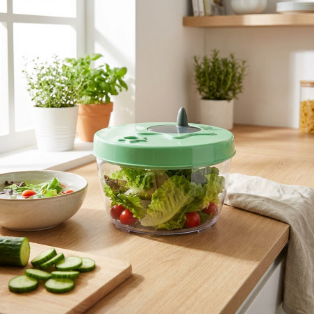 Praktische Salatschleuder. Bereiten Sie Ihren Salat schnell und einfach zu. Manuelle Bedienung. Maße: Ø 160 x 135 mm. Nettogewicht: 0,24 kg.