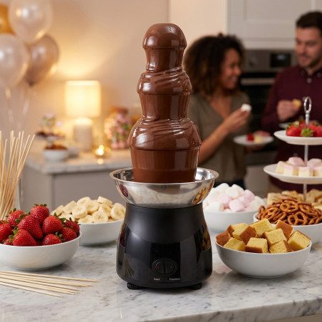Schokoladenbrunnen , 38 cm hoher Fondueturm, schwarz. Gefertigt aus Edelstahl mit ABS-Sockel. Erzeugt einen Wasserfall aus flüssiger Schokolade und hält diese warm zum Eintauchen von Speisen. 38 cm hoher Turm mit drei Etagen. Separater Heizschalter. Fontänenfunktion. Verpackt in einer bedruckten Box. Inklusive Bedienungsanleitung in 7 Sprachen.