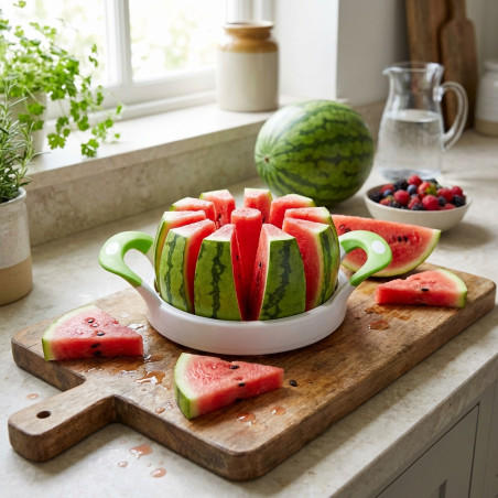 Geeignet zum Schneiden aller Wassermelonensorten. Schneidet 12 gleichmäßige Scheiben. Klingen aus Edelstahl. Auch für Ananas geeignet. Ergonomischer Griff. Rutschfeste Griffe. Material: Kunststoff, Soft-Touch-Gummi und Edelstahl. Mit Aussparung in der Mitte zum einfachen Herausnehmen der Scheiben. Durchmesser: Bis zu 28 cm. Abmessungen: 377 x 278 x 72 mm. Nettogewicht: 0,670 kg.