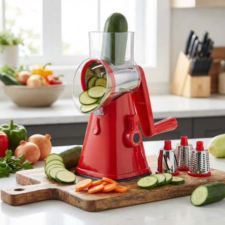 Reibe/Schneider mit benutzerfreundlichem Kurbelmechanismus. Drei austauschbare Edelstahlklingen ermöglichen schnelles und effizientes Gemüseschneiden. Der rutschfeste Standfuß sorgt für sicheren Halt, und die abnehmbaren Teile erleichtern die Reinigung.