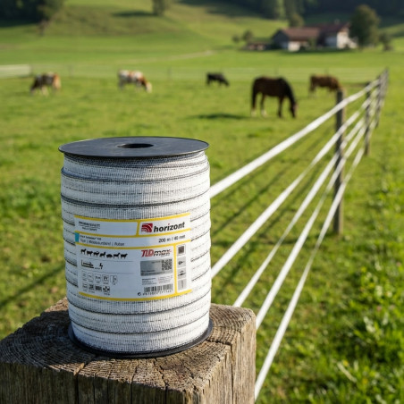 200 m x 40 mm T40 Elektroband für lange Zäune. Maximale Leitfähigkeit und erstklassige Haltbarkeit gewährleisten einen konstanten Stromfluss und hohe Sichtbarkeit als Abschreckungsmittel.