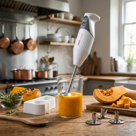 Dank seines ergonomischen Designs ist es für komfortables, längeres Arbeiten ausgelegt. Der Griff liegt perfekt in der Hand und bietet sicheren, rutschfesten Halt. Darüber hinaus garantieren die robuste Konstruktion und die hochwertigen Materialien eine außergewöhnliche Langlebigkeit und machen diesen Mixer zu einer lohnenden Investition für Ihre Küchenausstattung.