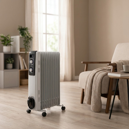 Ölradiator mit 3 Leistungsstufen: 800, 1200, 2000 W. Er verfügt über 9 Heizelemente mit hoher thermischer Trägheit , einstellbarem Thermostat und Sicherheitsschmelzklebstoff mit Begrenzer. Darüber hinaus verfügt es über LED-OP-Leuchten, multidirektionale Schwenkräder, einen Tragegriff und eine Kabelhalterung. Seine Abmessungen betragen mit Rädern 250 x 630 x 395 mm und ohne Räder 140 x 590 x 395 mm. Anschluss an 230 V ~ 50 Hz.