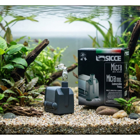 Micra Tauchwasserpumpe 0,6 m – 400 l/h Mini-Aquarienpumpe, verstellbare Springbrunnenpumpe für Teich und Aquarium. Die Tauchpumpen der Sicce Easy Line-Serie mit Förderleistungen von 300 bis 4000 l/h zeichnen sich durch ihre kompakte Bauweise aus, die den Betrieb auf kleinem Raum erleichtert. Das Sortiment umfasst die Modelle Mi-Mouse, Micra, Nova, Idra, Extrema und Suprema. Hierbei handelt es sich um multifunktionale Pumpen, die für alle Arten von Anwendungen geeignet sind, die eine Wasserumwälzung erfordern, wie z. B. Springbrunnen, Aquarien usw. Sie verfügen über eine variable Durchflusseinstellung und Adapter zum Anschluss flexibler Schläuche von 13 bis 20 mm (je nach Modell). Optional mit geerdetem Kabel erhältlich.