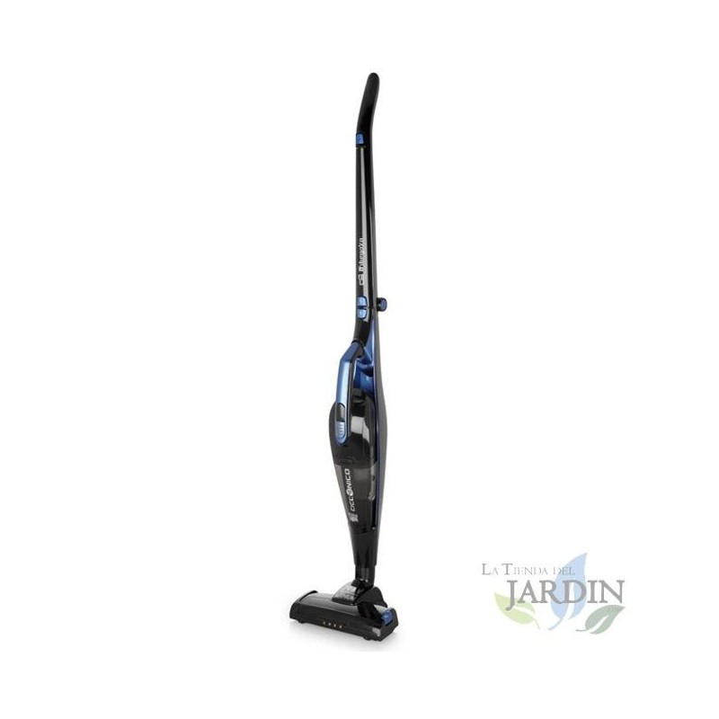 Akku-Bürstenstaubsauger mit 29,6-V-Lithiumbatterie und zwei Geschwindigkeiten: ECO / TURBO. Autonomie von 55 Minuten im ECO-Modus, Zyklonfiltersystem mit HEPA-Filter und 3-in-1-Design für eine vollständige und effiziente Reinigung.
