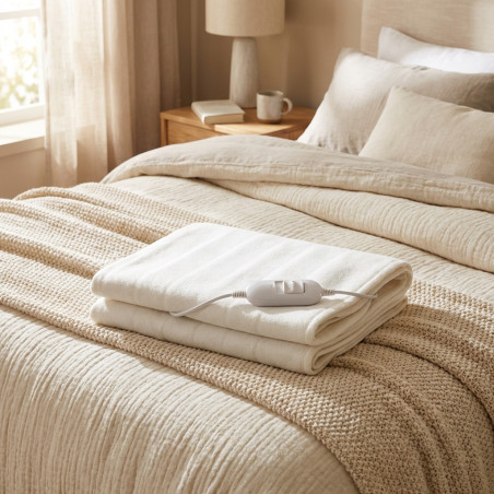 Elektrische Heizdecke, ideal zum Warmhalten im Bett. Größe: 150 x 80 cm. Material: Weiß, 100 % Polyester. 1 x abnehmbare Fernbedienung. 2 Heizstufen. LED-Anzeige. Überhitzungsschutz. Maschinenwaschbar. Leistung: 60 W. Spannung: 220–240 V ~ 50 Hz.