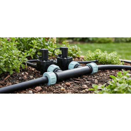 Bewässerungskollektor 1 für 2 oder 3 Gartenmagnetventile. 1 x 1 x 1 Gewinde. Seiten- und Endauslässe mit verrückter Drehung, die die Montage von Bewässerungsmagnetventilen erleichtern. 2 Seitenausgänge. Schützender O-Ring.