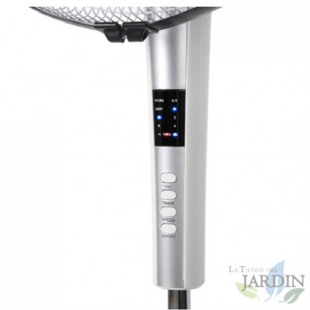 2 in 1, Stand- oder Tischventilator mit 3 Lüftungsgeschwindigkeiten, Propellerdurchmesser 40 cm mit Leistung von 65 W und 90°-Oszillation. Tragegriff bis 138 cm höhenverstellbar, Kopf höhenverstellbar. Sicherheitsgitter mit 3 Modi: Normal, Brise und Nacht. Kontrollleuchten, programmierbar für 7,5 Stunden. Fernbedienung, Farbe: Weiß, Silber und Schwarz. Spannung 230 V~50 Hz.