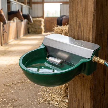 Trinkbrunnen komplett aus Aluminium und Edelstahl gefertigt . Diese automatische Tränke für Pferde sorgt für einen konstanten Wasserstand, der über ein Hochdruckventil reguliert werden kann. Es wird an der Wand befestigt und verfügt über einen unteren Stopfen zum Ablassen des Wassers.