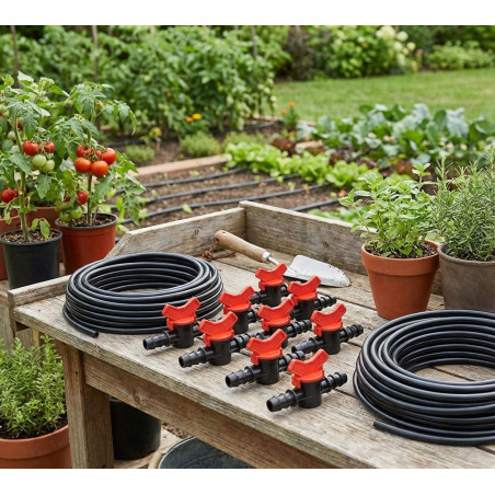 Packung mit 20 16-mm-Tropfbewässerungs-Absperrhähnen: Hochwertiges Absperrventil für die Tropfbewässerung, hergestellt in Italien. Tropfbewässerungszubehör, hergestellt in Italien, höchste Qualität. Die Tasten können je nach Hersteller rot oder grün sein. Packen Sie 20 Einheiten ein.