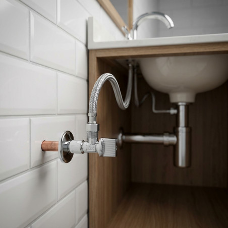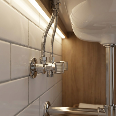 Eckabsperrventil mit Filter 1/2-1/2": Diese Ventile werden in der Hausinstallation eingesetzt und eignen sich besonders gut zur Minimierung von Kalkablagerungen. Sie ermöglichen das individuelle Absperren der Wasserzufuhr zu Waschbecken, Toiletten und anderen Entnahmestellen für Reparatur- oder Austauscharbeiten. Abmessungen: 1/2 x 3/8 Zoll. Verchromt. Nenndruck: 16 bar. Temperaturbereich: Kalt- und Warmwasser bis 95 °C.