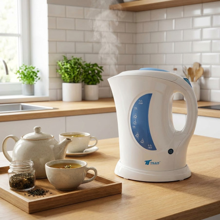 Der ideale Wasserkocher für Tee- und Aufgussliebhaber. Er fasst bis zu 1,7 Liter. Dank des Griffs liegt er gut in der Hand und ist hitzebeständig. Nach Erreichen des Siedepunkts schaltet er sich automatisch ab. Der Filter ist zur einfachen Reinigung herausnehmbar. Eine Kontrollleuchte zeigt den Betriebszustand an. Das Heizelement aus Edelstahl sorgt für optimale Leistung.