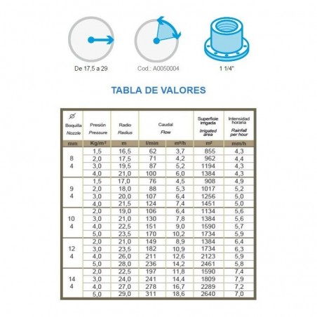 Jolly irrigation cannon with 360º circular irrigation angle, 1 1/4'' female thread and a range of 17.5 to 29 metres. Ideal for use in agricultural irrigation.