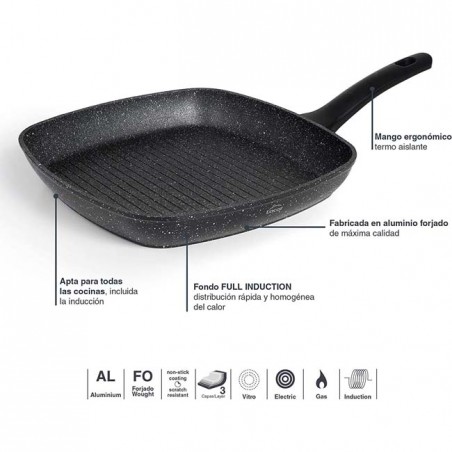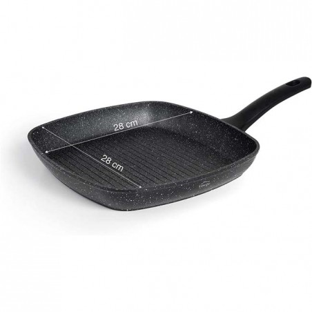 Grill pan with stripes, grill. Made of top quality forged aluminum. TRI-layer non-stick coating reinforced with stone-based particles, free of toxic and heavy materials. Ecological and PFOA-free. Energy saving, up to 45% more efficient, thanks to its FULL INDUCTION diffuser base. The aluminum base allows for even heat distribution, allowing food to cook quickly and evenly, with hardly any oil. Maximum wear resistance. Easy cleaning inside and out thanks to its non-stick protection. Compatibility: all types of cookers, including induction. Measurements: 28 x 28 cm. 2-year warranty.