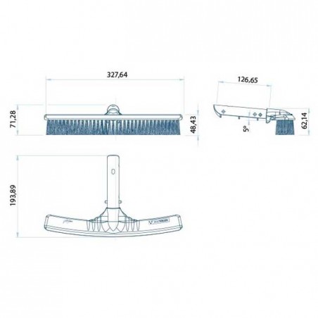 Made of shark grey polypropylene with a rough finish. White and blue polypropylene bristles. Maximum effectiveness in cleaning pool walls with all types of coatings. The angle between the bristles and the handle is only 5º so that the brush adapts completely to the wall and allows dirt to be removed with minimal effort. Possibility of fixing to telescopic handle using a clip or wing nut system.