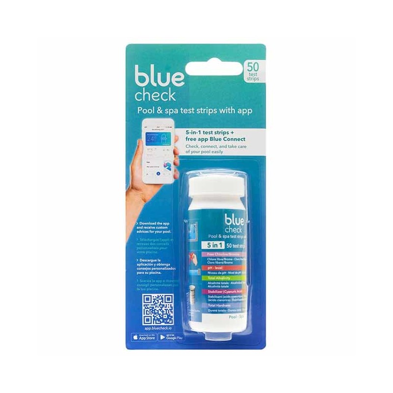 Pack of 50 analytical strips for measuring the following parameters: pH level / free chlorine / bromine / total alkalinity / hardness / cyanuric acid. As simple as dipping the strip and obtaining a personalized recipe for treating your pool water through the free downloadable App. A practical, low-cost solution that will allow you to know what your pool or spa needs at all times.
