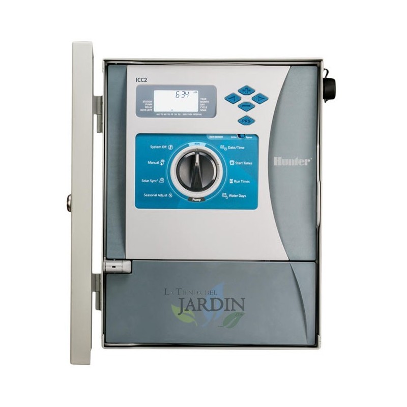8-station irrigation programmer, expandable to 54 zones with 4, 8 and 22-station modules. 4 independent programs. 8 start times per program. 12 hours of maximum irrigation operation per station. 2 simultaneous irrigation programs. Maintains memory in case of power loss. Connector for water pump or master valve. 1 input for sensor.