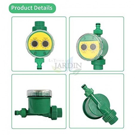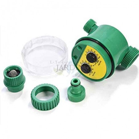 Analogue tap programmer used in gardens or terraces. Irrigation time from 1 minute to 120 minutes. Irrigation frequency by hour, day and weekly. Uses 2 AAA 1.5 volt batteries (not included). Internal ball drive. 3/4 thread. Maximum supported pressure 6 bar. Registered trademark Suinga. DELAY function: allows delaying the start of irrigation from 1 to 12 hours.
