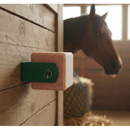 The Suinga metal bracket is designed to attach the mineral salt block directly to the wall, providing convenient, hygienic, and safe access for the horse. Its wall mounting prevents the block from falling to the ground or getting dirty, keeping the supplement readily available.