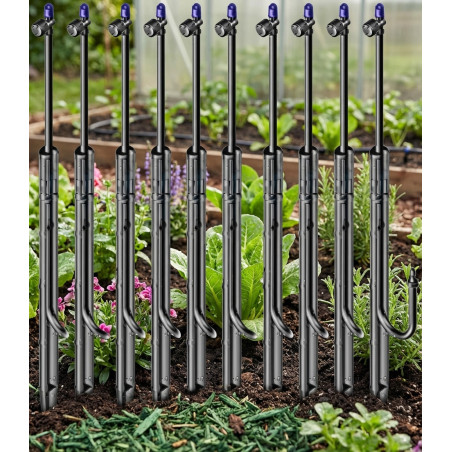Adjustable micro-sprinkler with 300 mm stake for micro-irrigation applications, in a bag of 10 units. Available in various spray radii (3 spray patterns): 90°, 180°, and 360° (18 jets). Delivered pre-assembled with the micro-sprinkler and micro-tube for quick installation. The rigid rod inside the stake can be raised or lowered to suit the height of the plants being irrigated. Distributes water evenly over the irrigation surface. Optimal performance and proportional rainfall.