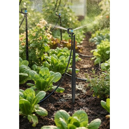 360º Ballerina Micro Irrigation Sprinkler with 40 cm Stake (Pack of 10): 360º rotating angle ballerina irrigation sprinkler. Flow rate 73 to 125 l/h. Range radius 3 meters. Made in Spain with high quality plastic materials. Includes 40 cm connector stake. Bag of 10 units. Ask for price for large quantities.