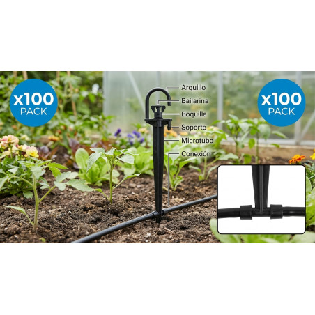 360º rotating angle irrigation dancer. Flow rate 73 to 125 l/h. Range radius 3 meters. Made in Spain with high quality plastic materials. Includes 40 cm connector stake. Bag of 100 units. Ask for price for large quantities.