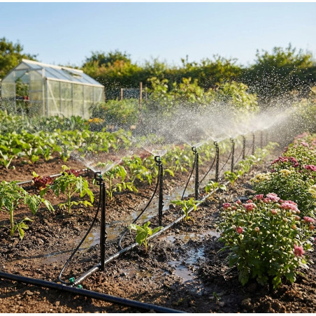 Micro-drip sprinkler system with a fixed 360º angle micro-sprinkler and 40 cm stake for a range of 2.5-3 m. Ideal for watering gardens and orchards.