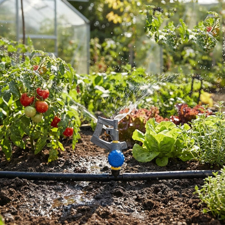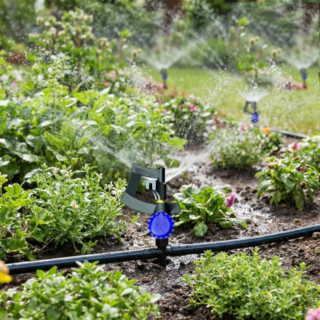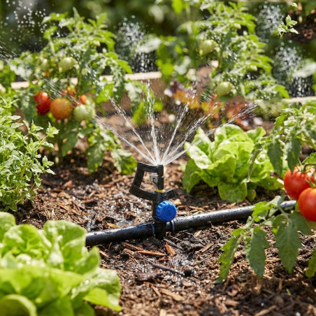 Adjustable 360º Dancer Micro Sprinkler . Range radius 0 to 3.8 metres. Flow rate 0 to 105 l/h. Recommended water pressure 1 to 2 bar. Can be directly inserted into the drip line. Pack of 25 microdiffusers.