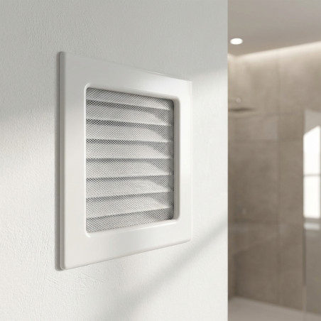 White fixed ventilation grille, 17x17 cm, with pre-frame, louvers, and mesh. Improves air circulation and protects against insects. Easy installation and discreet design for ductwork.