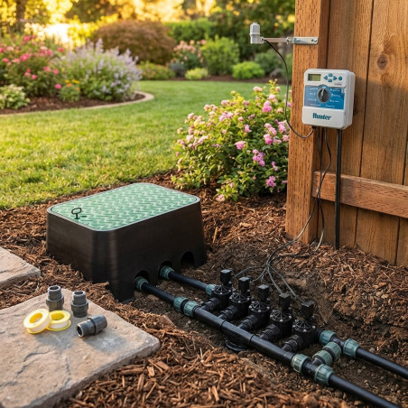 Hunter Automatic Irrigation Kit . The automatic irrigation system allows us to automate the irrigation of your garden easily and simply. Automatic irrigation set for irrigation that includes the following material: Hunter XCORE 8-zone indoor programmer, 8 100HV 24v solenoid valves, 12-meter 12mm Teflon, 9 32mm PE male thread links, 18 plugs 1, collector for 8 irrigation zones, rain sensor, and 65x53x30 cm box with key. This kit allows direct connection with a 32mm pipe. If you need advice for connection to another pipe, contact latiendadeljardin.com and we will help you. Made in Spain, high quality products.