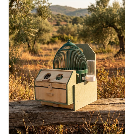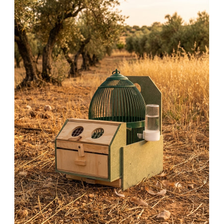 Excellent pack consisting of a partridge decoy cage without a shelf, a wooden stand and a waterer