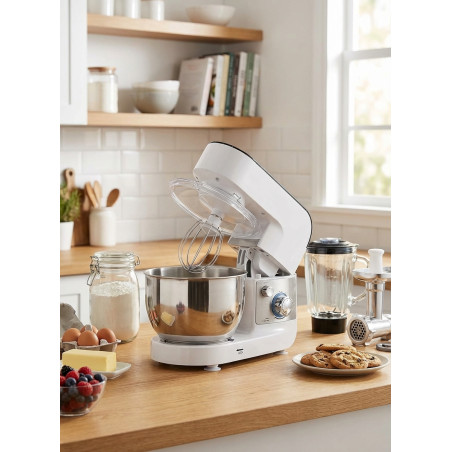 The Delicy mixer-kneader is a highly versatile appliance. Compatible with the meat grinder and sausage-making attachments, as well as the glass blender jug, it features a dual-speed button (slow/fast) thanks to a two-speed bearing-driven mechanism, allowing for the quick and efficient preparation of various types of sausages, such as chorizo, sausages, and Catalan sausages. The manual control panel is very intuitive, with a display, timer, and speed selector. Stable and safe: Non-slip suction feet ensure maximum stability. The mixing rod and kneading attachment are made of aluminum with a non-stick coating, while the wire whisk is stainless steel. All accessories are easily interchangeable and washable. Dimensions: 32.5 x 25 x 36.5 cm. Weight: 6.35 kg. Power: 1000 W. Speed: 13,500 rpm . Capacity: 5 L. Voltage: 220-240 V; 50/60 Hz
