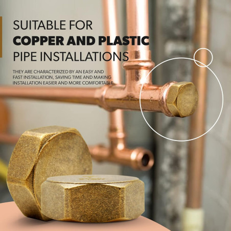 Pack of 5 x 1 1/4 female brass plug. 1 1/4 size. Female thread. Fitting used in high pressure irrigation installations. Used in civil works and irrigation installations. Made of brass. Made in Spain. Measurements equivalent to inches: 20mm = 1/2, 25mm = 3/4, 32mm = 1, 40mm = 1 1/4, 50mm = 1 1/2.