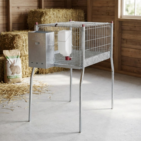 Rabbit cage made of reinforced galvanized wire, including a large-capacity (approximately 3-4 kg) three-compartment feeder. It has a front opening and can be installed with or without legs, and can be fitted with a nest box for raising baby rabbits.