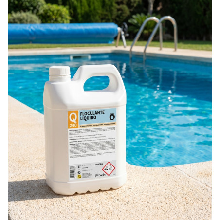 Liquid product for swimming pools that binds suspended solids and causes them to precipitate. Recovery treatment: With the filtration system off and no bathers present, add 10 ml/1 m³ of water. Pour the dose into a container of water and distribute the solution evenly over the pool. After approximately 8 hours, collect and remove the layer of flocs that has settled at the bottom of the pool. Maintenance treatment: This can be carried out using a dosing pump, injecting 0.5 ml of product per m³ of circulating water before the filter. Composition: Aluminum sulfate hydroxide chloride.