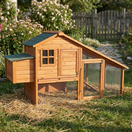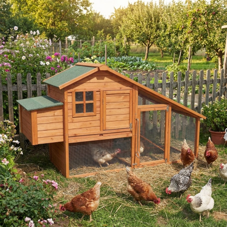 High quality wooden chicken coop with a large run and nest. Independent doors to access the nest and allow the chickens direct contact with the ground. Made in Spain. Measurements: length 195 cm, depth 77 cm, height 105 cm.
