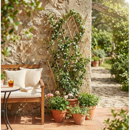 Extendable bamboo trellis , used in garden areas, to support climbing plants and/or create natural and pleasant environments. Highly decorative product, easy to install and very versatile. Made in Spain.