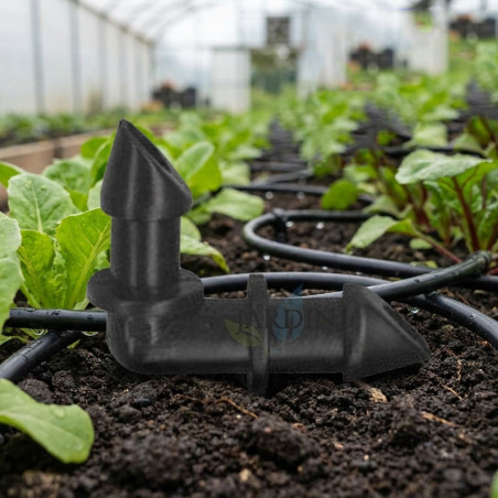 4mm microtube elbow . Accessory used in drip irrigation. Used to join 4.5 x 6.5 mm microtubes. Black color. High quality. Supplied in a bag of 50 units.