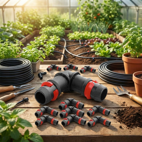 16mm drip irrigation elbow with safety ring. Union for 16mm diameter drip tube, black