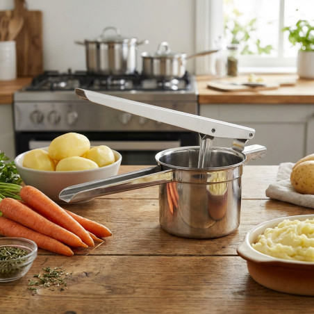 Our potato masher is made of food-grade 430 stainless steel and is safe to use. Multifunctional design: This potato masher is not only suitable for mashed potatoes, but also for mashing vegetables, carrots, various fruits, dumplings, and more. It can even be used as a baby food press. Want to make fresh juice? It also serves as a great fruit drink maker. Easy to clean: It's dishwasher safe. Plus, it's made of non-stick steel that glides easily under running water. Dimensions: 9 x 28 x 11 cm.