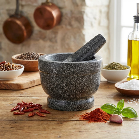Durable granite mortar and pestle set, bowl approx. 10 x 14 cm (height x diameter). This heavy-duty kitchen utensil won't slip or move while crushing or grinding ingredients. The deep bowl of the spice mortar prevents contents from overflowing. The granite mortar is perfect for crushing herbs, spices, almonds, and nuts. The textured surface of the mortar and pestle ensures excellent results.
