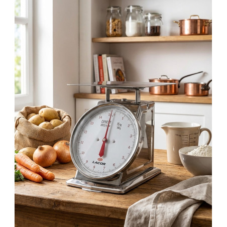 The mechanical scale with a weighing platform is a modern take on traditional scales: classic products are still in style. Despite the rise of electronic scales, many still prefer traditional models: mechanical scales are convenient, easy to use, and easy to read. They don't require batteries, are manually calibrated, and can handle heavier weights than electronic scales. Many users will find a mechanical scale more suitable for their everyday kitchen needs, even if it doesn't offer the same precision as an electronic one. The Lacor mechanical scale with a weighing platform is made of 18/10 stainless steel (an alloy with 18% chromium and 10% nickel, offering higher quality and resistance than conventional steel). It supports a maximum weight of 15 kg and has a 50g scale.