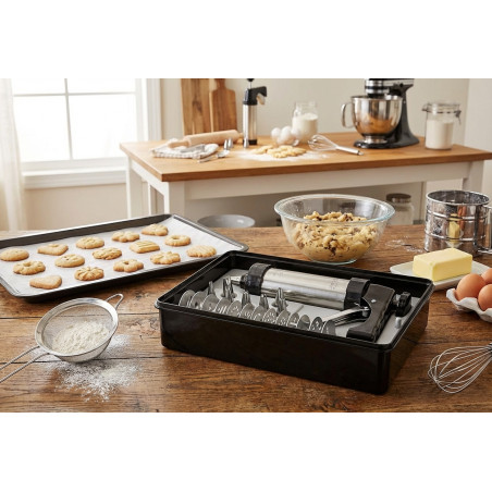 This pastry gun set includes 8 nozzles and 13 discs, all with different designs, and will satisfy even the most demanding users with its versatility. On the one hand, the pastry gun with the 8 nozzles performs the same functions as a piping bag, an essential tool for working with baking and pastry recipes. On the other hand, the pastry gun with the 13 discs will allow you to prepare cookies and pastries quickly and easily, with a variety of shapes and an unbeatable presentation that you can't achieve manually or with cookie cutters. The parts of this pastry gun set, including the gun body, nozzles, and discs, are made of 18/10 stainless steel (an alloy with 18% chromium and 10% nickel, which offers a high level of quality and superior resistance compared to conventional steel). It offers excellent resistance to corrosion and food acids and salts. It is a smooth, non-porous and very hygienic material, easy to clean, and does not transmit strange flavors to food.