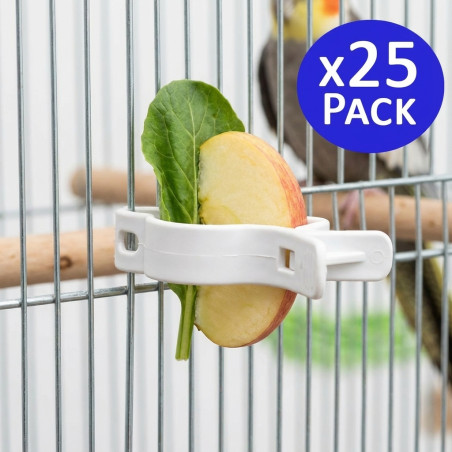 Plastic clip that easily attaches to the bars of the cage and is designed to hold fruit, snacks, vegetables or anything else your pet needs. It is a durable and very useful accessory, suitable for any type of cage.