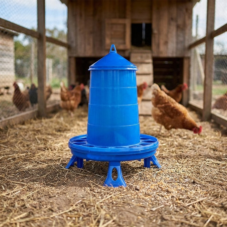 Plastic hoppers for chickens and other birds. Made of highly resistant plastic, they are lightweight and can be adapted to any type of need, whether hanging or with legs to place them directly on the ground. The truncated cone-shaped tank prevents the feed from compacting and regularly falling onto the plate. The plate, which is considerably high and ridged towards the inside, has an anti-waste ring, preventing the birds from throwing and wasting the feed. The lid helps us to prevent any dirt from entering the inside of the tank, while keeping the feed in good condition. The galvanized rod handle allows it to be suspended and hung with the supplied cord, fixed at the height that is considered convenient.